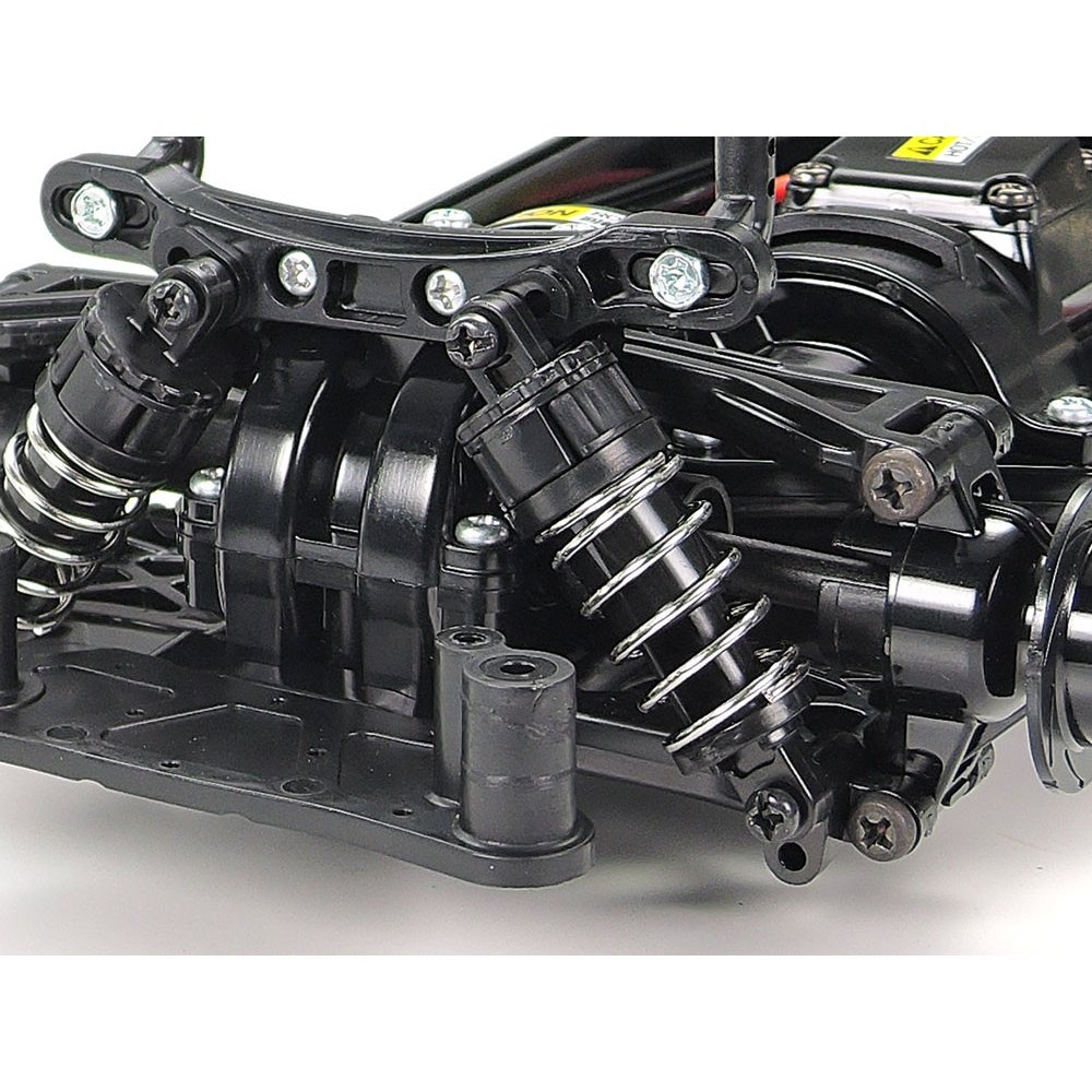 The shaft-driven 4WD TT-02 chassis employs a longitudinal layout with the battery on the left and the motor on the right, to give excellent stability. In addition, it features identical left and right suspension arms and uprights for ease of assembly, plus easy-to-maintain gearboxes. It is a highly adaptable chassis, as it offers 2 different wheelbases, 2 ground clearance settings and 2 tread set-ups in addition to a range of 10 possible gear ratios. It is not short on looks either, with brake disc-shaped wheel hubs and stylish front bumper supports. Gun metal color 12-spoke wheels use treaded semi-pneumatic tires.