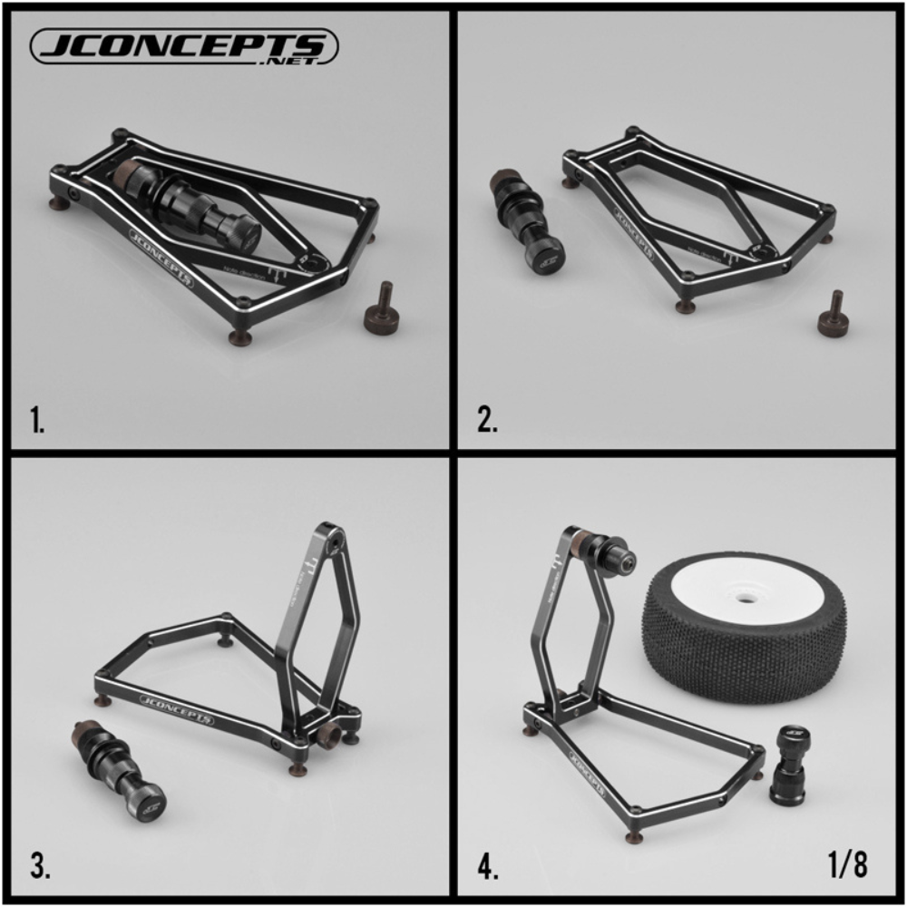 The base of the item is built to protect, position and maintain a small footprint at all times. The base has 4 stand-off legs to hold a steady structure while a thumb screw secures the upright in either the up or down position. The JConcepts balancer is pre-assembled and backed by JConcepts customer support and racing team lineage.